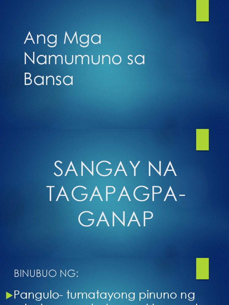 13112018 Sangay ng pamahalaan 1. 16012018 Tungkulin ng Pangulo at Sangay na Tagapagpaganap Magsilbing komandante ng Sandatahang Lakas ng Pilipinas Ibinigay sa Pangulo ang kapangyarihang pangunahan ang militar upang matiyak ang pangingibabaw ng kapangyarihan ng mga sibilyan Magsumite ng panukalang taunang kita at gastusin ng pamahalaan sa Kongreso Taun taon ay naghahanda ang tanggapan ng Pangulo ng panukalang badyet ng pamahalaan. Ang bansa nating Pilipinas ay may pamahalaang.
