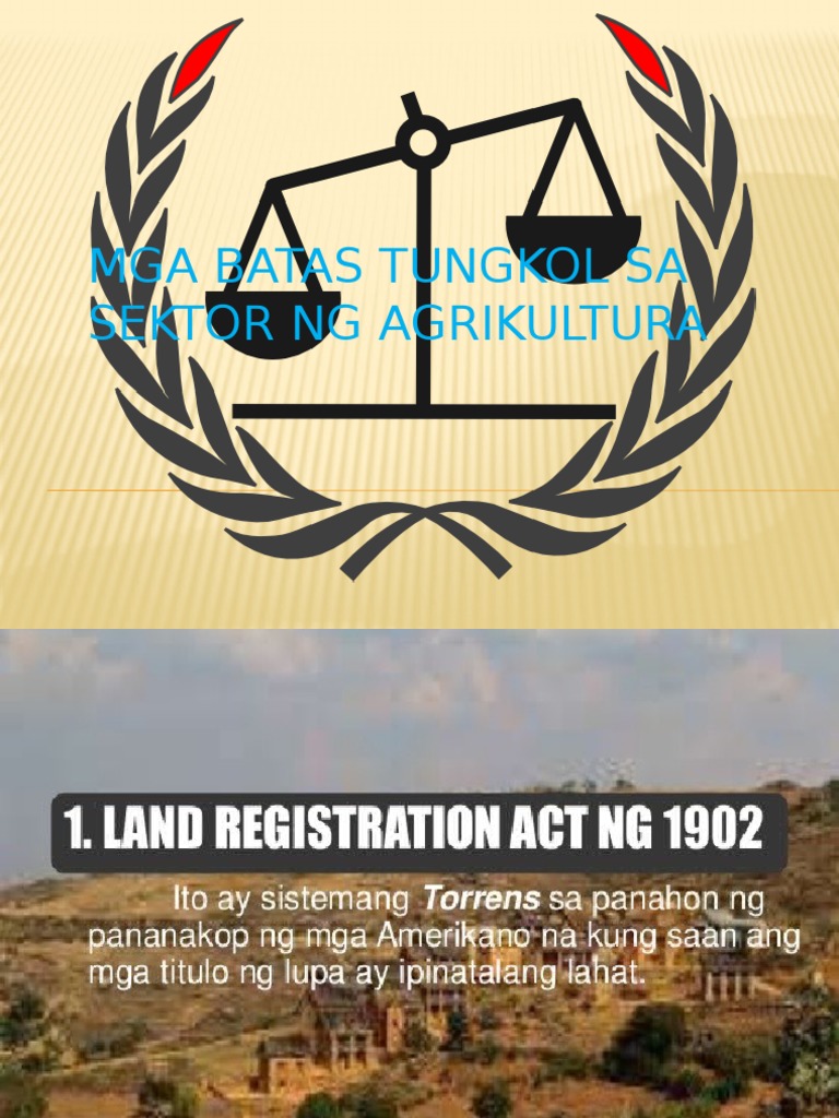 2Public Land Act ng 1902 Dito napapaloob ang pamamahagi ng lupa sa mga pamilya na nagbubungkal ng lupa. 02102017 Ano ang mga batas ng sektor ng agrikultura 1Land Registration Act ng 1902 Sistemang Torens noong panahon ng mga Amerikano kung saan lahat ng titulo ng lupa ay pinatala lahat. Ngunit pakaisipin natin na bilyong bilyong piso na ang naibuhos ng gobyerno sa agrikultura ngunit may problema pa rin tayo sa food security.