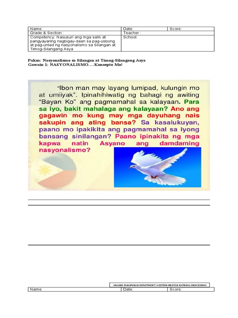 Natatalakay ang mga salik at mga pangyayaring nagbigay-daan sa pag-usbong at pag-unlad ng nasyonalismo sa Silangan at Timog-Silangang Asya2. Masusuri ang proseso ng pagbangon ng damdaming nasyonalismo sa Asya. Ang nasyonalismo ay damdaming makabayan na maipakikita sa matinding pagmamahal at pagpapahalaga sa Inang-bayanayon sa aklat na SEDP Kabihasnang Asyano.