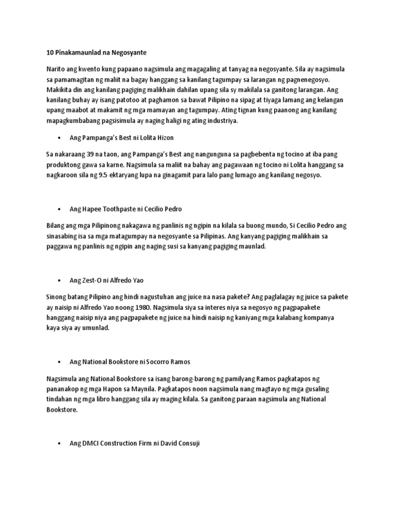 Mga magagaling na negosyante sa pilipinas. Roa- Santa Maria West Central School- Division of Ilocos Sur 22. 05072017 Bata pa lamang si Ronald Callao natuto na siyang magbanat ng buto at mamulat sa negosyo. 19042013 Nangako si mayoralty candidate Adel Gunigundo sa maliliit na negosyante sa Valenzuela na ipapatupad niya ang RA 9178 o BMBE Barangay Micro Business Enterprise law upang bumaba ang business taxes.